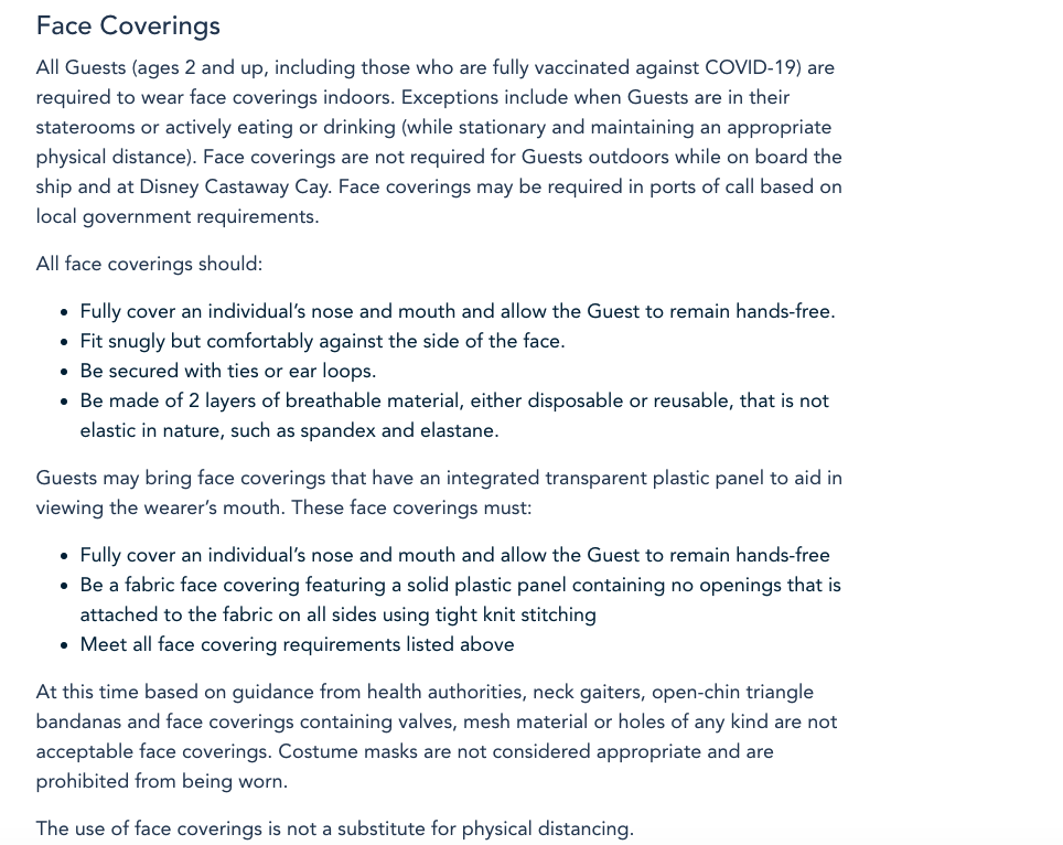 Note that masks may be required at ports of call depending on local government rules. The Disney Cruise Line website then notes the types of masks that are acceptable. See more details below.