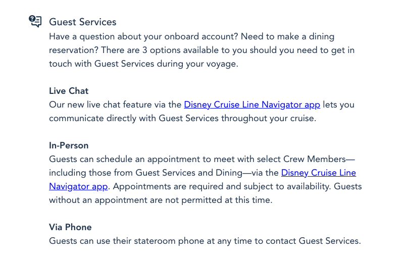 If you need to speak with a Cast Member or need assistance with something online, Disney has specified that you’ll be able to use the Live Chat feature on the Disney Cruise Line Navigator app (discussed above), use the phone in your stateroom, or speak with someone from guest services in-person.