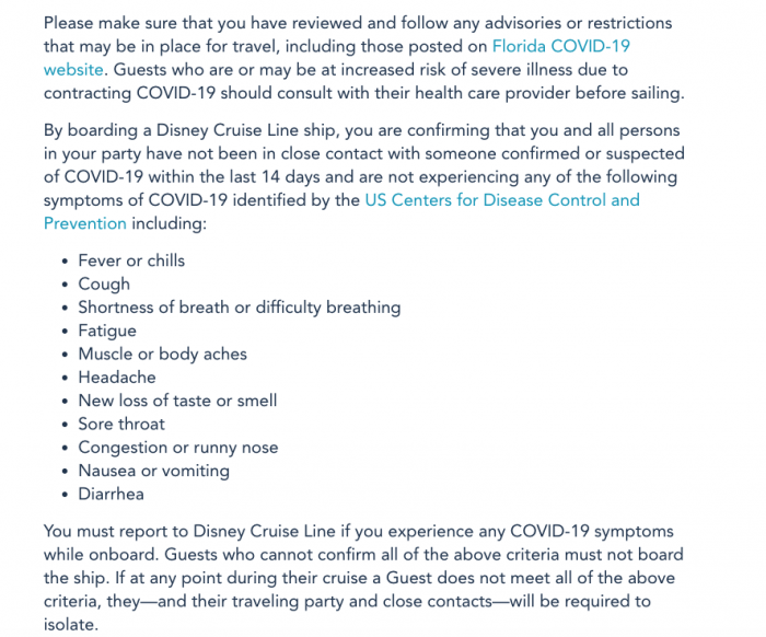 Note that it specifies “You must report to Disney Cruise Line if you experience any COVID-19 symptoms while onboard.”