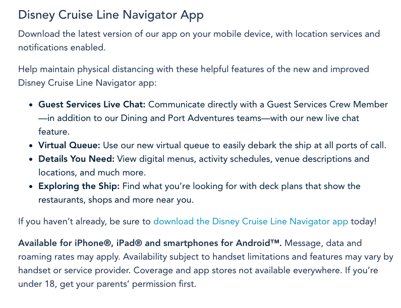 Disney has also updated some features on their Cruise app. The app will now include the ability to chat with a Guest Services Crew Member, sign up for a virtual queue to debark the ship at all ports of call, look at digital menus, and more.