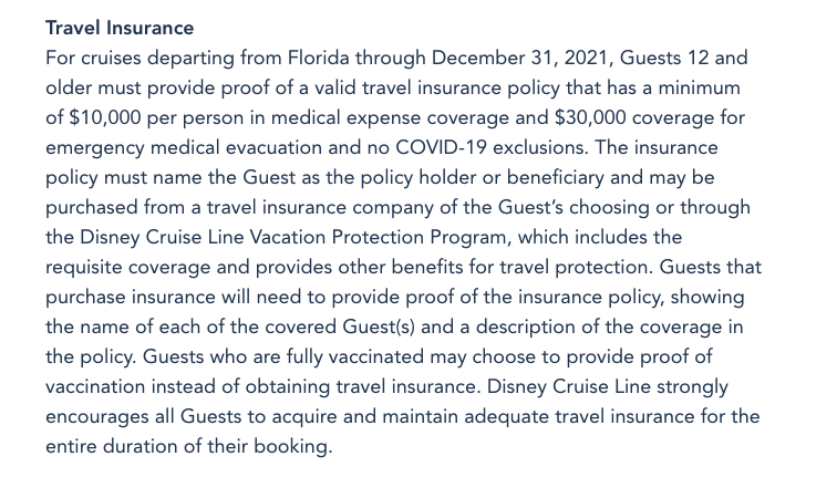 For all Disney Cruises departing from Florida through December 31st, 2021, all guests ages 12 and older will need to obtain and provide proof of valid travel insurance that meets certain minimum coverage levels.