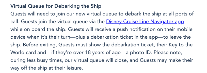 UPDATE: The Disney Cruise Line website now notes that debarkation times are based on dining time and guests do not need to join the virtual queue to debark the ship on debarkation day.