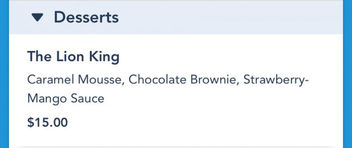 The Lion King consists of Caramel Mousse, Chocolate Brownie, and Strawberry-Mango Sauce for $15.