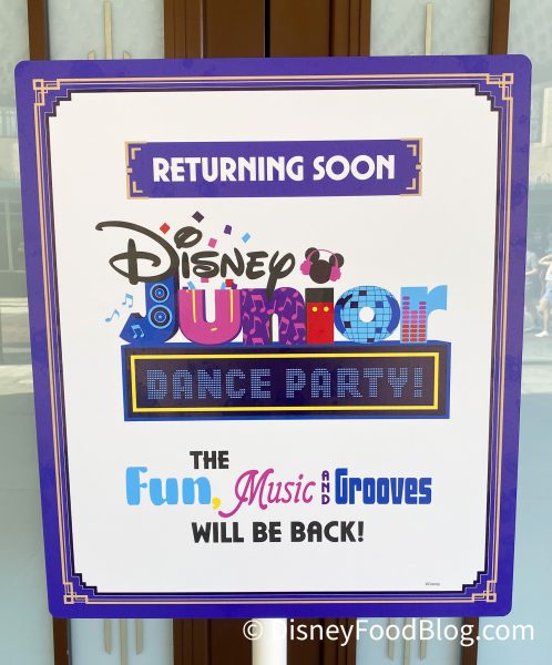 If you’re looking for more live entertainment in the parks, you and your kids may be in for a treat. We spotted signs outside of the Disneyland Theatre in Disney California Adventure announcing that the Disney Junior Dance Party will return soon!