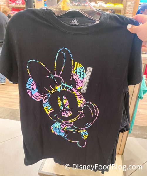 If you’re looking for something a little less “old school” and instead want something a little more “modern,” we spotted this t-shirt for $24.99 featuring Minnie Mouse illustrated by a bunch of fun words!
