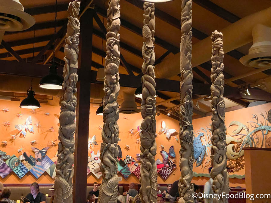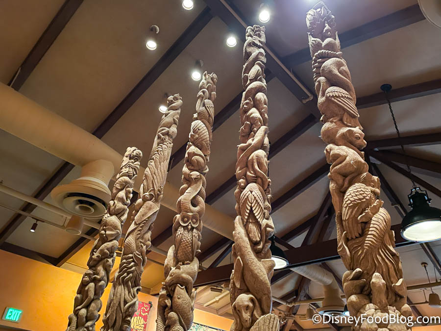 The restaurant has three different dining rooms (which guests are encouraged to explore like they would an art gallery) and in one of the rooms, you’ll find five GIANT totem poles that only long-time Disney fans will recognize.