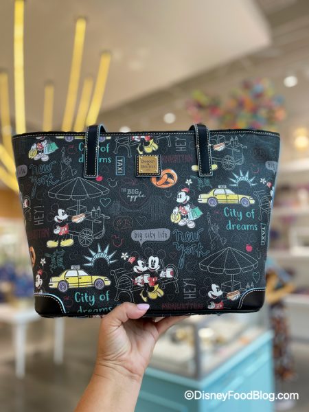 Plus, the print on it has all of our favorite things: hot dogs, Mickey, Minnie, and pretzels, mixed in with some NYC icons!!