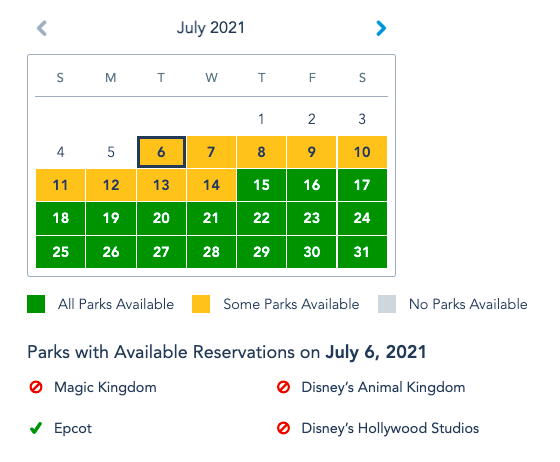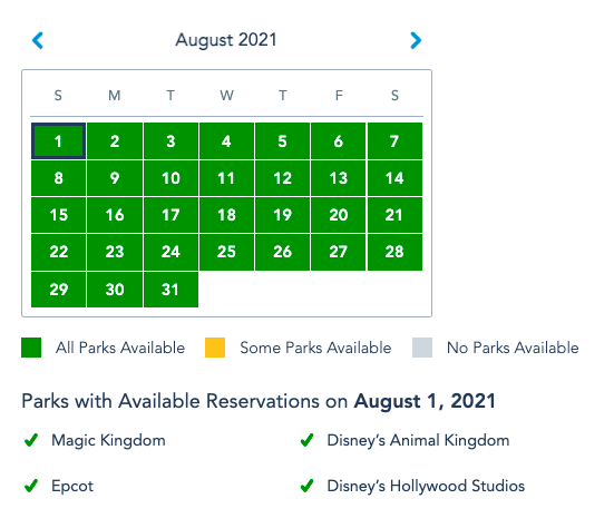 You can see on the calendar above from about a month ago that passes were limited until about July 15th when we looked a little over a week out. Under the calendar, you can see which parks have available passes. When we looked at this calendar (on July 6th, 2021), there were available passes for EPCOT each day and a few days with Disney’s Animal Kingdom. The green days on the calendar indicate that there are passes available for all the Disney World parks.