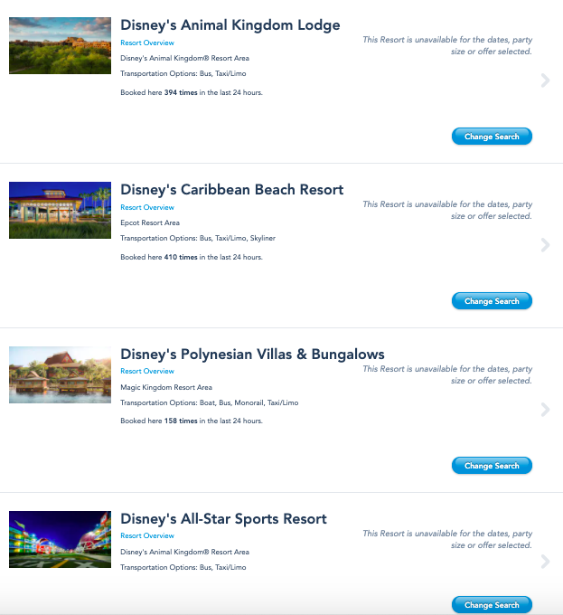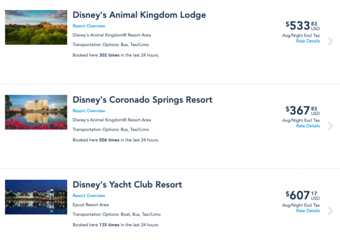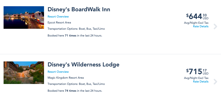 There was one moderate resort available at this time: Disney’s Coronado Springs Resort, but it was still $367 per night. A few Deluxe Resorts — Disney’s most expensive hotels — were also available, including Disney’s Animal Kingdom Lodge, Disney’s BoardWalk Inn, Disney’s Wilderness Lodge, and Disney’s Yacht Club Resort.