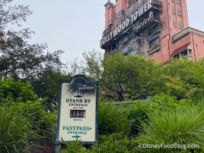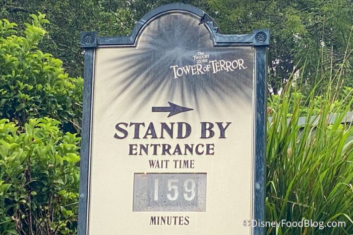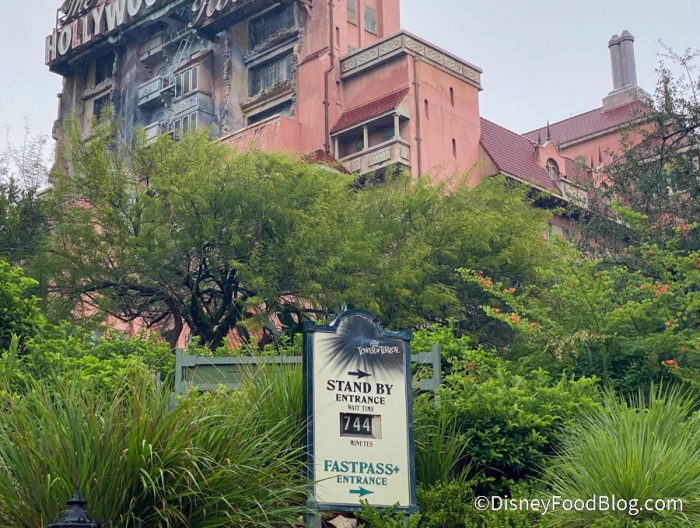But get this, we asked a Cast Member about the obviously malfunctioning sign — AND WE WERE TOLD IT WAS HIT BY LIGHTNING. And of course, we didn’t buy that in the least (considering the ride’s theme), but two other Cast Members said they too believe the Tower of Terror wait sign was hit by lightning and damaged. They could have been kidding to keep the malfunction in theme with the attraction. Or…maybe it WAS hit by lightning?! ⚡️