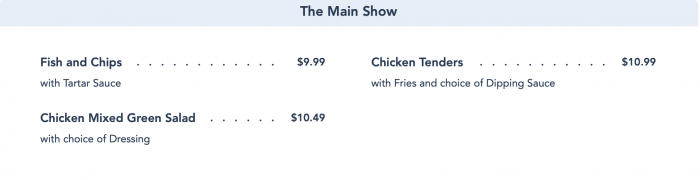 As for the menu, entrees include Fish and Chips, Chicken Tenders, and a Chicken Mixed Green Salad.