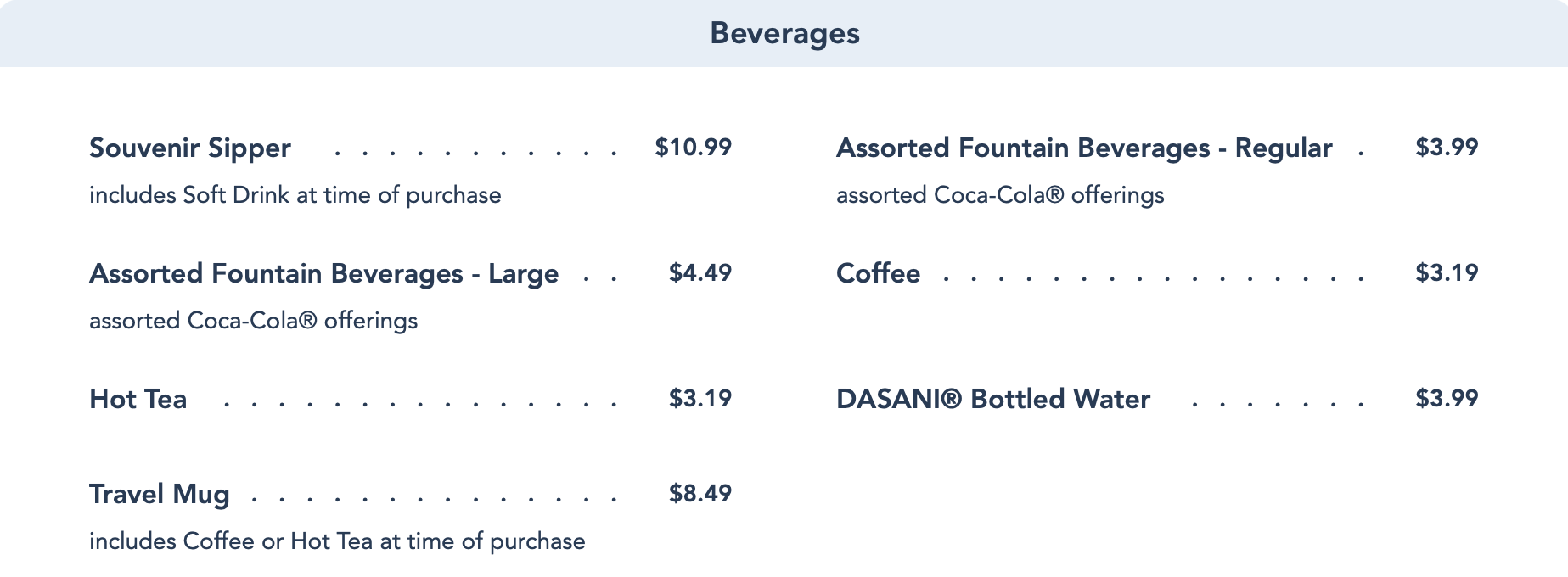 And beverages include a Souvenir Sipper and other assorted fountain beverages as well as Coffee and Hot Tea that you can get in a Travel Mug.