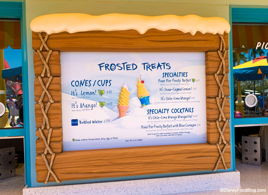 The Parfait is Non-Dairy Lemon Soft Serve with Blue Raspberry Swirl and a splash of Blue Curaçao. It’s really just the normal Pixar Pier Frosty Parfait but with some alcohol!