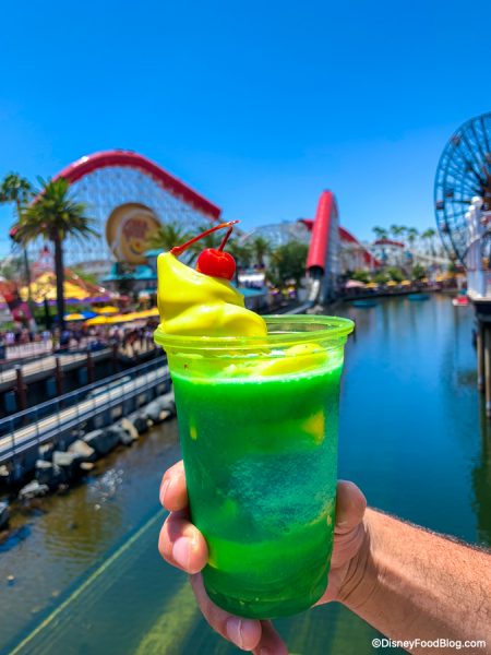Obviously there are the classics, like Dole Whip floats, Citrus Swirls, and Mickey Ice Cream Bars, but we also love to shake it up a little a try treats like the Key Lime Cake Shake and funky themed slushies! Today we tried out a NEW frozen item in Disneyland’s California Adventure, and this one has booze, folks!