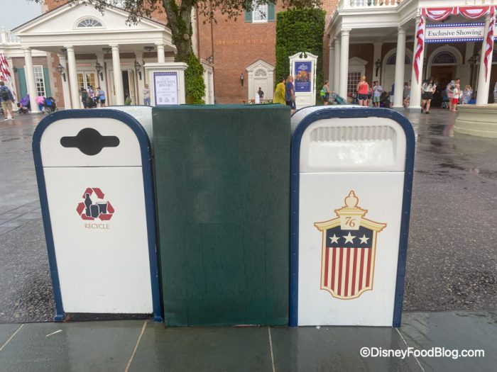 In front of The American Adventure Pavilion we found a trash can, and a recycling bin, but we also spotted a mysterious green box in between them! What could that be for?