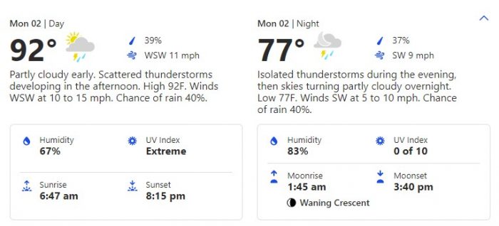 Get ready for a 92 degree high and a 77 degree low. Plus, like most summer days, August starts with scattered thunderstorms appearing in the afternoon. Snag that rain layer when you leave for the park if you wanna stay dry!