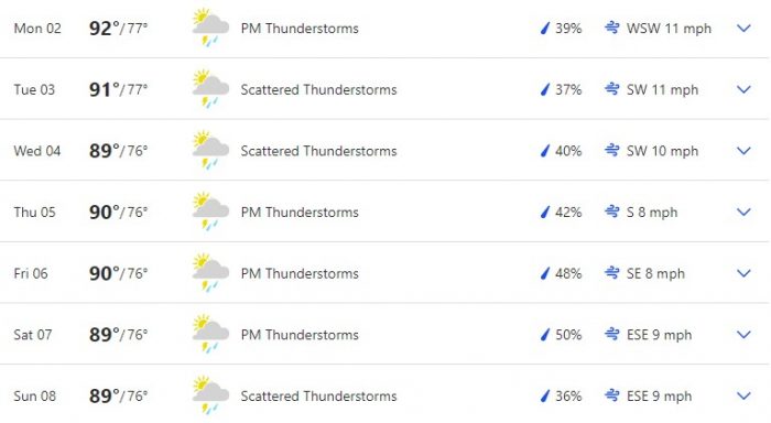 Here is a full overview of the week according to The Weather Channel. Temperatures are projected to hang out in about the same place for the whole week. We’re looking at a range of high 80s to low 90s highs and mid to high 70s lows.