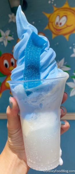 It’s themed to the 8th wonder of the world you see every time you ride the Jungle Cruise! We thought this was the perfect treat for someone with a big sweet tooth! The Sprite is on the bottom with Vanilla and Cotton Candy swirled Ice Cream layered on top. To get the perfect combination of flavors, we mixed it all together!