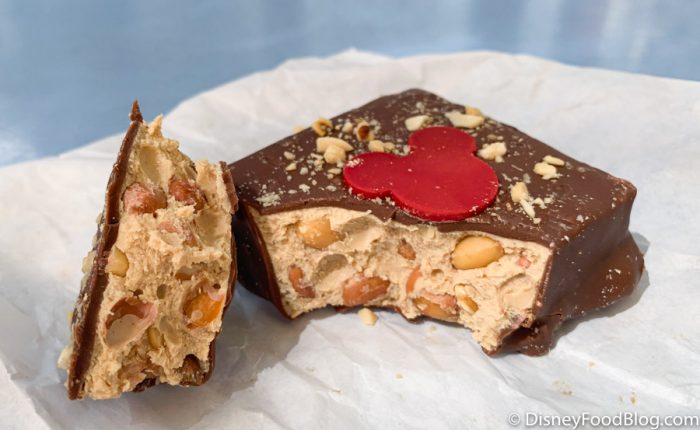 It was just as amazing as we remembered it. Peanut butter and chocolate fans this is a must-have for you. The treat has a soft peanut butter filling throughout and the peanuts are on top and in the filling add the extra crunch that really sets this treat apart. It is also topped with a red Mickey that is made of white chocolate.