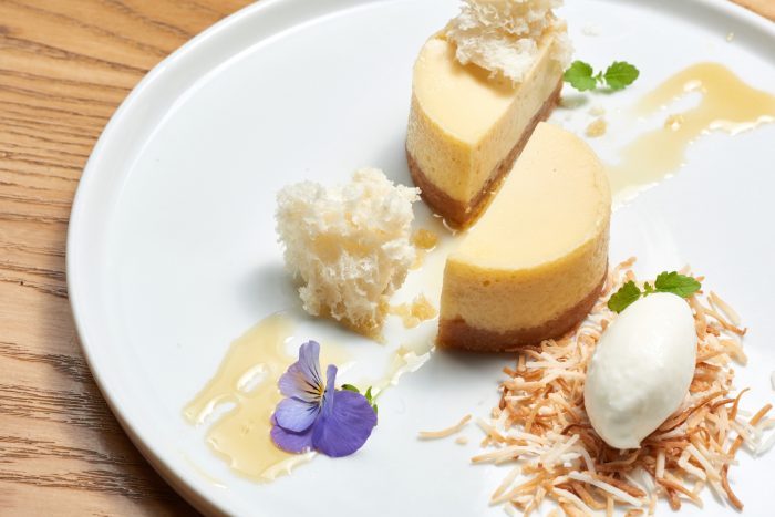 The restaurant compares this dish to key lime pie, which makes sense since yuzu is a citrus fruit known for its tart flavor! The yuzu pie is made with (of course) yuzu, mango compote, and yogurt air cake.