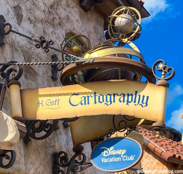 Recently, on a trip to Magic Kingdom, after we stopped by the reopened Prince Eric’s Market Village, a Disney Vacation Club Cast Member gave us some new Disney trivia! We talked to her at the H. Goff Cartography spot in Fantasyland in Magic Kingdom.