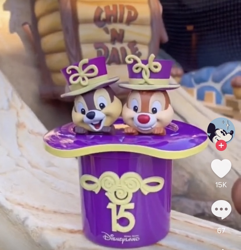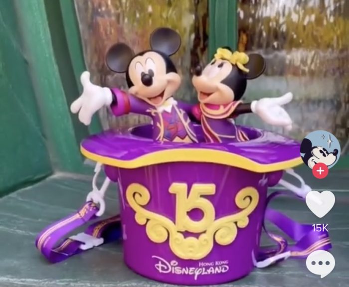 The Disney Parks TikTok account shared a look at some of the new souvenirs available at Hong Kong Disneyland for the 15th anniversary. First, there’s a Mickey and Minnie Popcorn Bucket that’s sure to be a must-have for collectors!