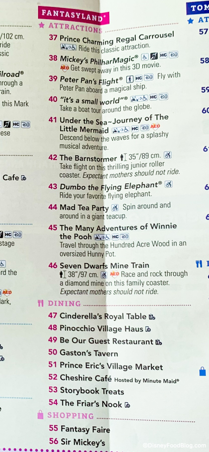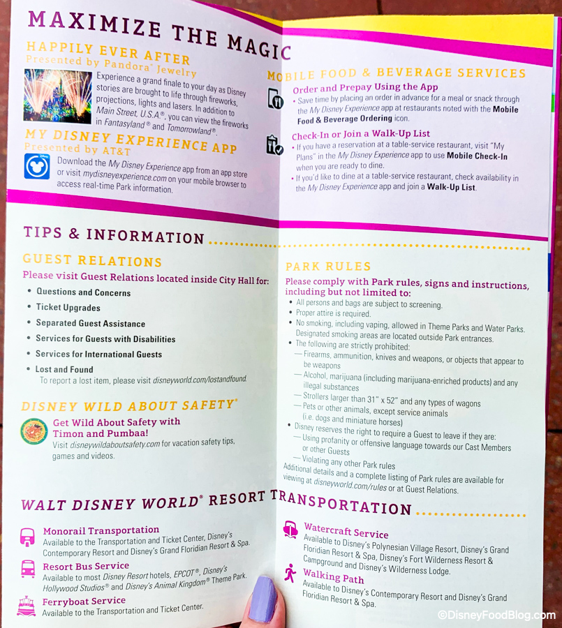 Then, there’s helpful info like how to use My Disney Experience as well as Park Rules and where to find Guest Relations.