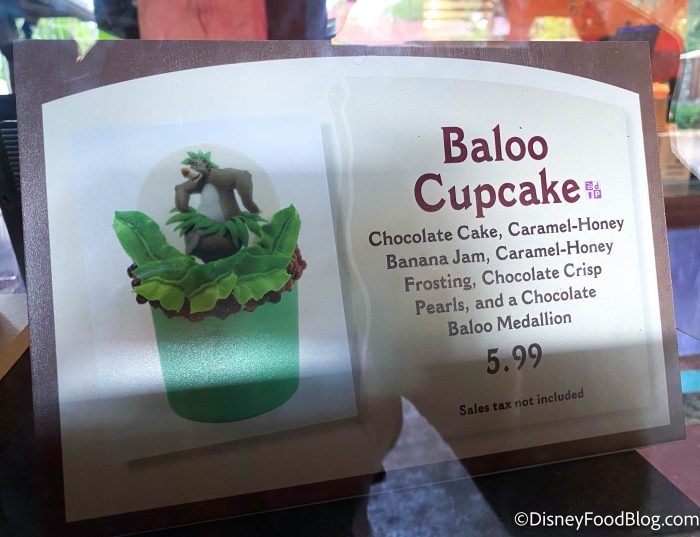 While July’s Tiger Cupcake reminded us of fall, August’s cupcake is more of a return to summer with this rich new cupcake! We found the new The Jungle Book-inspired Baloo Cupcake in Creature Comforts, also known as the Starbucks of Animal Kingdom, for $5.99. It’s described as chocolate cake with caramel-honey banana jam, caramel-honey frosting, chocolate crisp pearls, and a chocolate Baloo medallion.