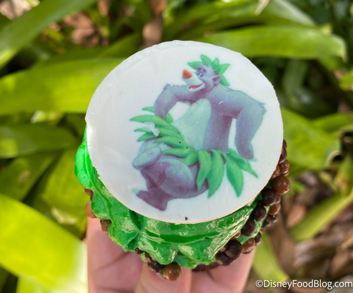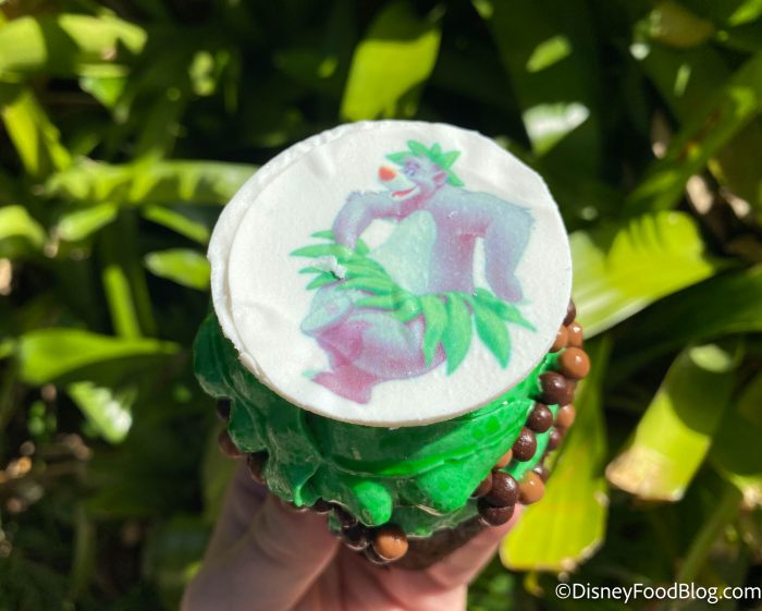 The Baloo Cupcake is bright and summery with green frosting, chocolate pearls, and a Baloo cupcake topper. We weren’t sure what to expect with the caramel-honey and banana flavors!