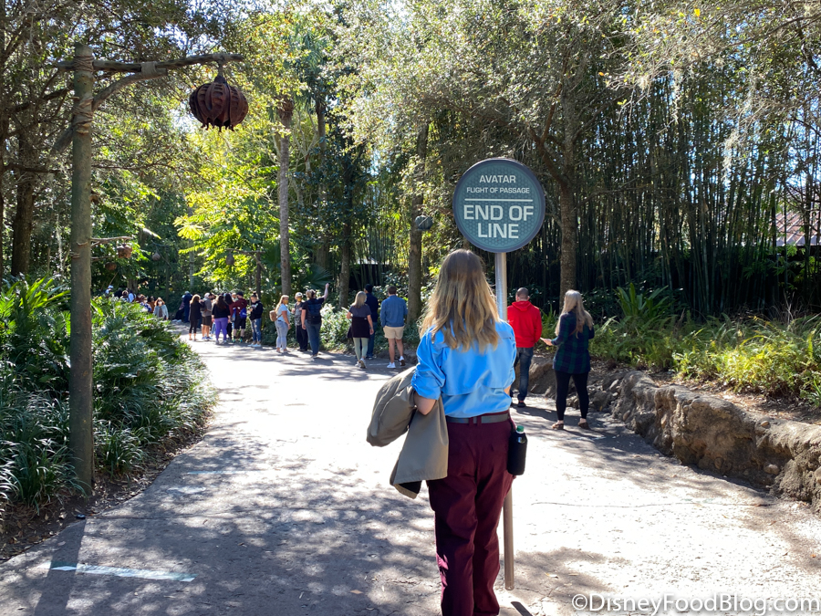 The hiccup is that you have to wait through the majority of the overflow line outside before you can even get to the cool indoor part! Most of it is outdoors, again in the Florida heat, and it’s ALWAYS long. (Sensing a pattern here? Cool indoor queues goooood. Hot outdoor queues baaaad!) And you don’t get to see a lot of cool details until you get inside, which can take forever. Sure, the beauty of Pandora is all around you, but you don’t have to stand in line to see it — you could always just grab a Night Blossom and sit somewhere in the shade to admire it.