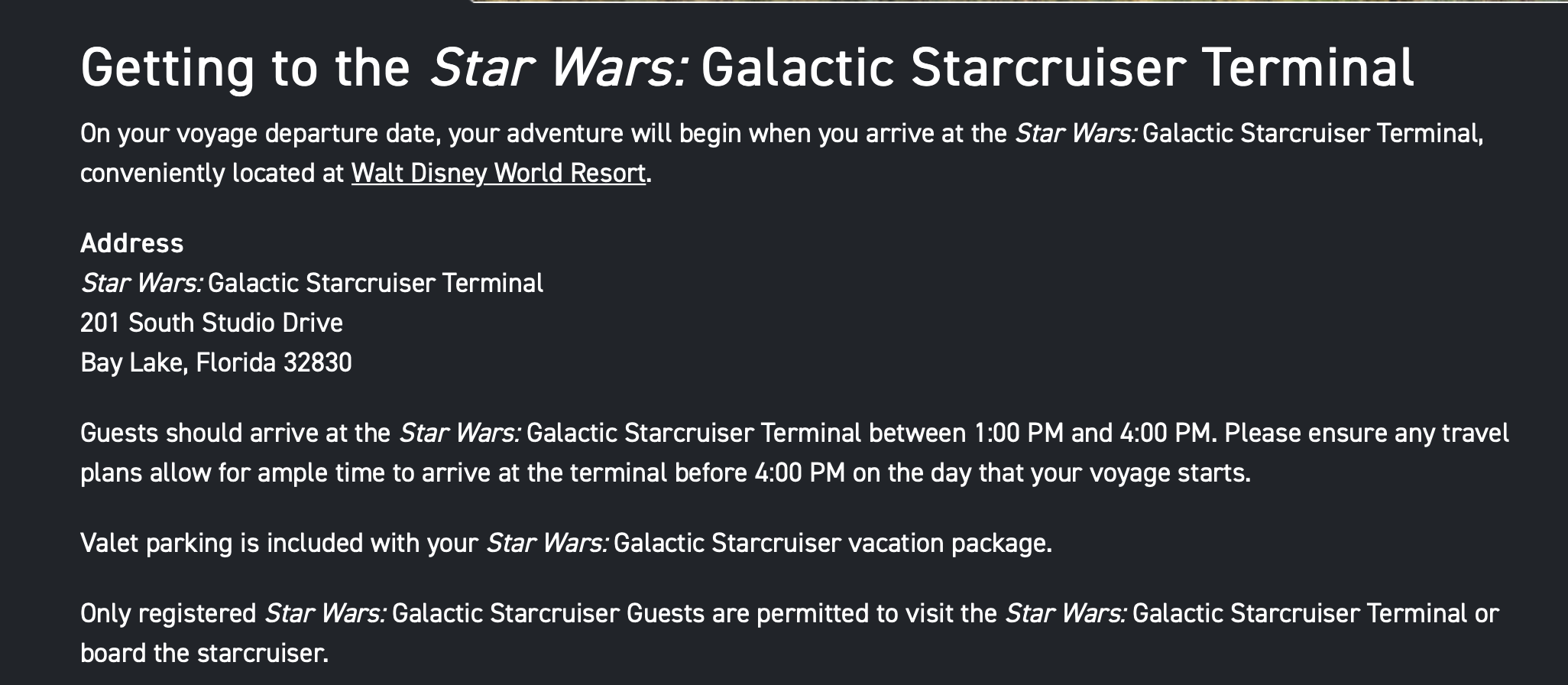 Disney has announced that guests should arrive between 1:00 and 4:00PM to “board” the Halcyon (aka enter the Galactic Starcruiser hotel).