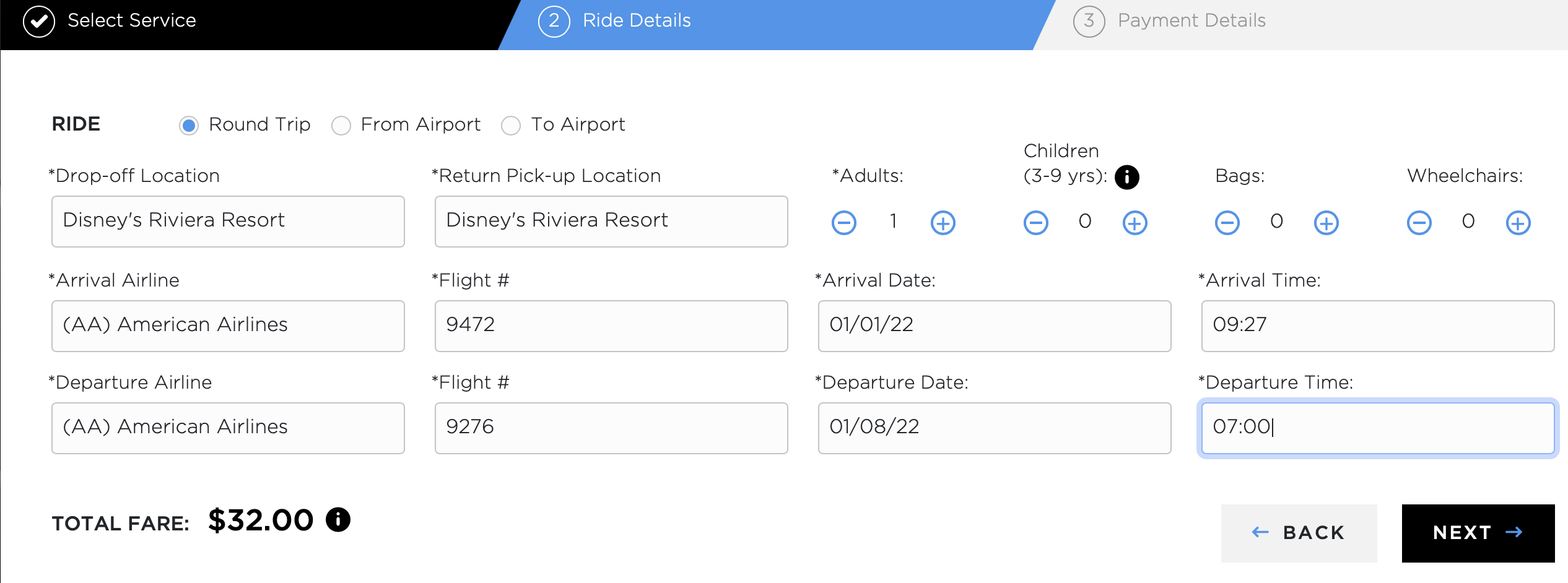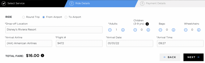 We found a flight on January 1st, 2022 to show you as a standard service round trip example and picked Disney’s Riviera Resort as our drop-off and pick-up location.