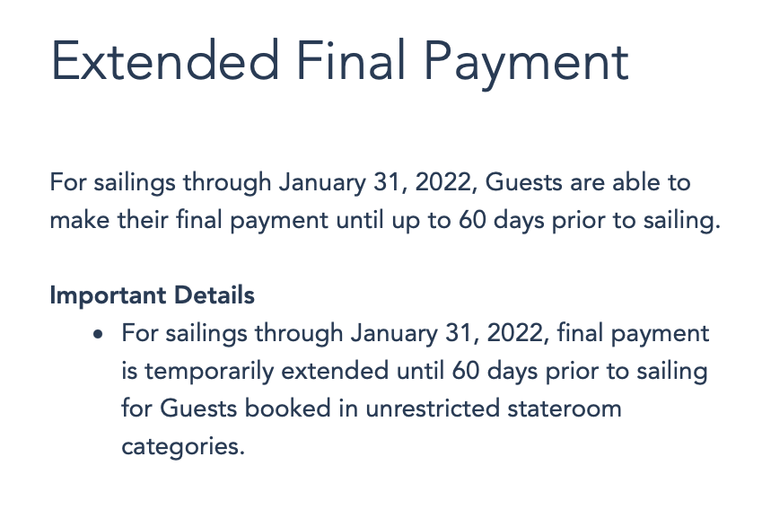 Disney has recently updated their final payment policy for Disney Cruise Line bookings, allowing guests to make their final payment up to 60 days prior to cruising with bookings through January 31, 2022. Previously, we saw Disney Cruise Line update their final payment policy through December 31, 2021.