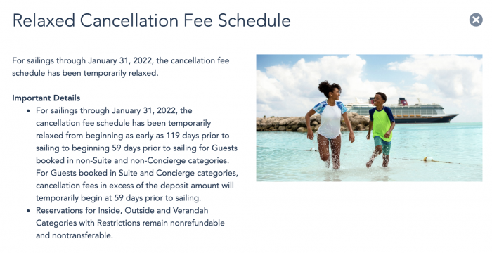 Disney Cruise Line has also updated their cancellation fees for bookings through January 31, 2022 (previously December 31, 2021). Cancellation fees have been relaxed as early as 119 days to 59 days prior to sailing, depending on your booking category. Make sure to read the fine print to see if your booking qualifies.