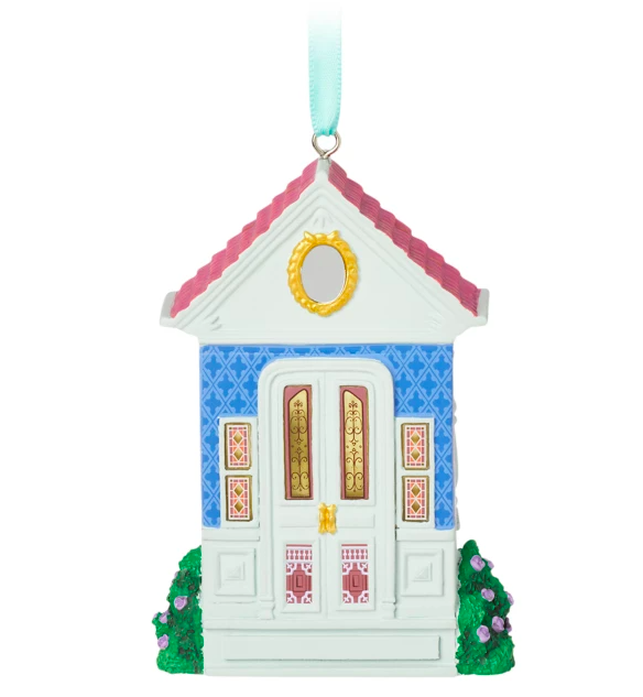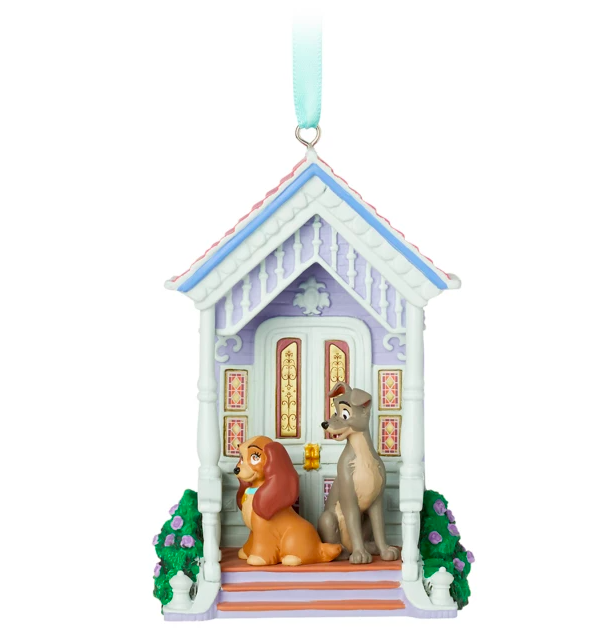 This ornament inspired by Disney’s Lady and the Tramp could double as a table-top decoration! It has Lady and the Tramp on the porch of a beautiful “gingerbread” Victorian-style house.