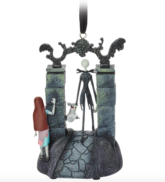 The ornament has a spooky stone archway with Jack Skellington and Zero inside and Sally peeking around the arch!