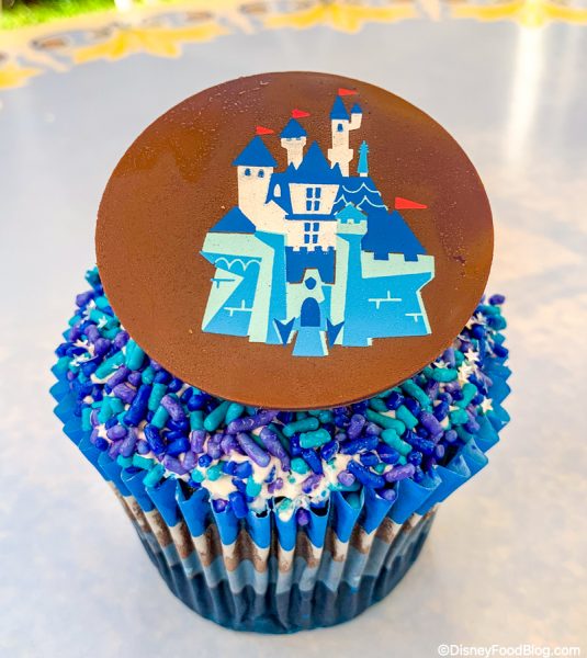 The celebratory treat is a double chocolate chip cupcake filled with cookies and cream mousse topped with cream cheese frosting. There’s also a piece of chocolate on top that’s printed with Sleeping Beauty Castle, and just look how pretty the two are together!