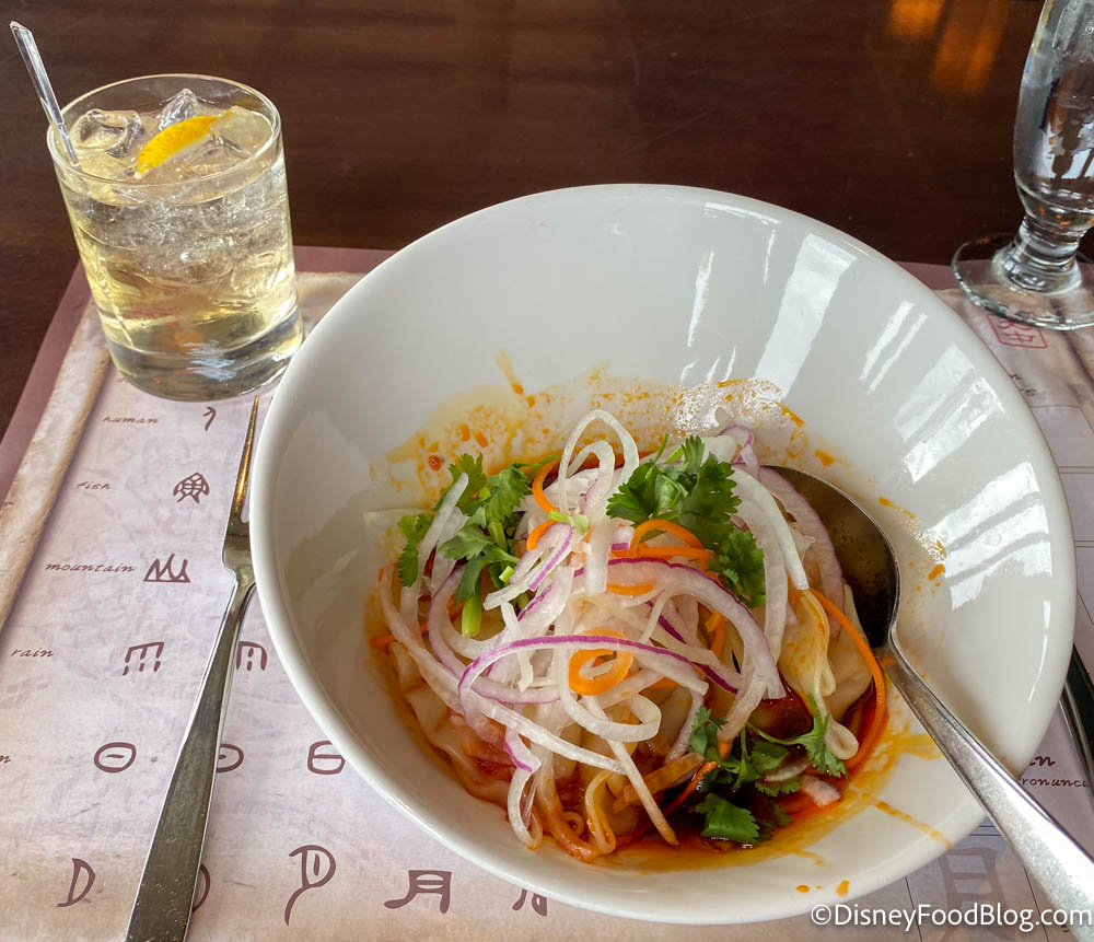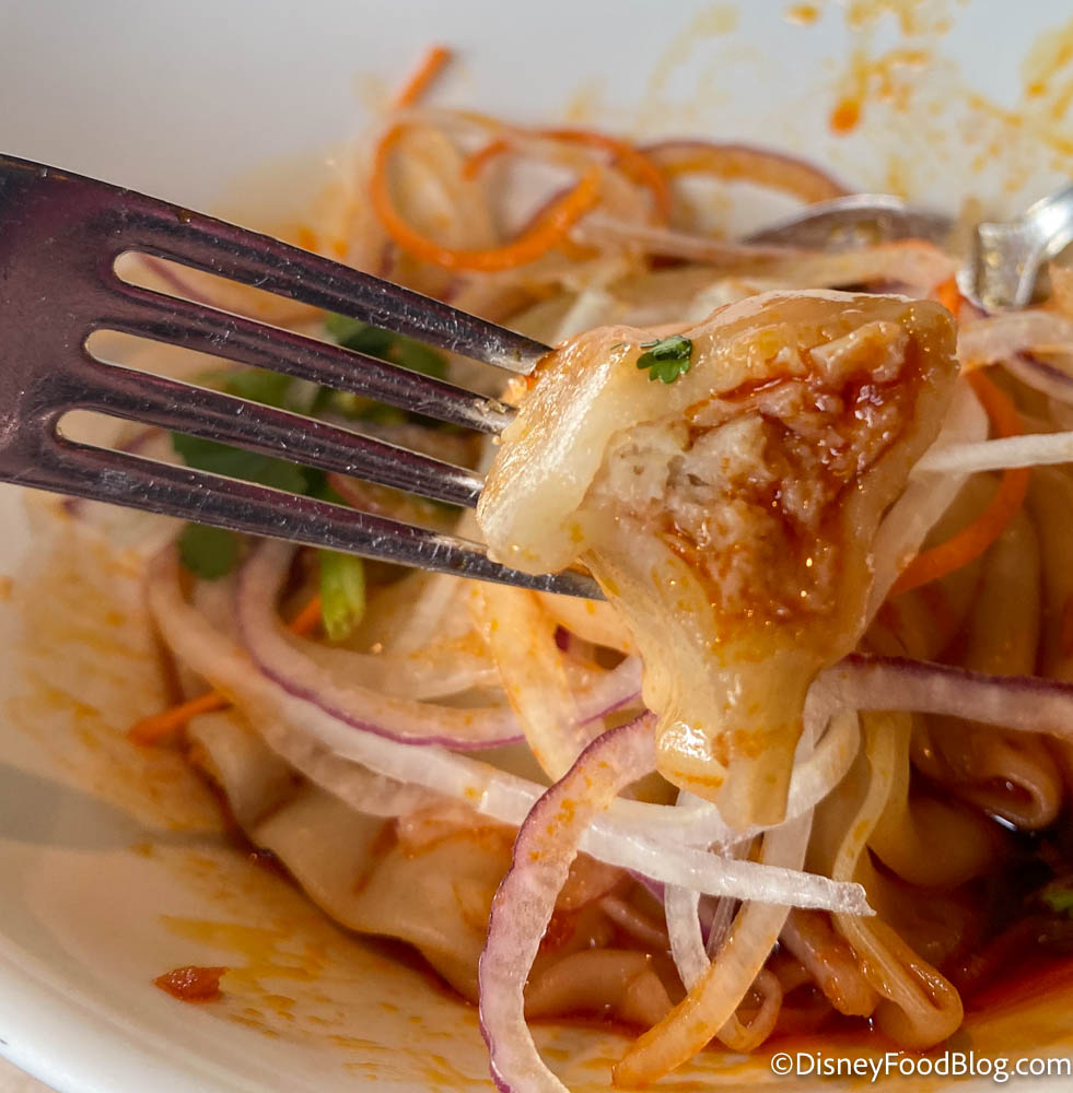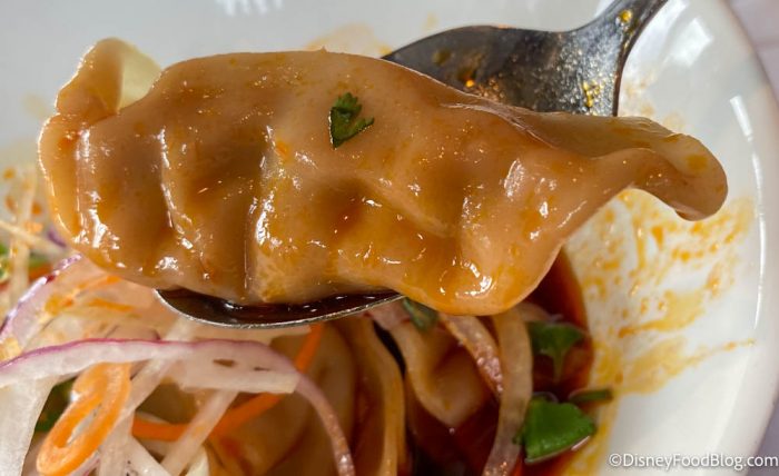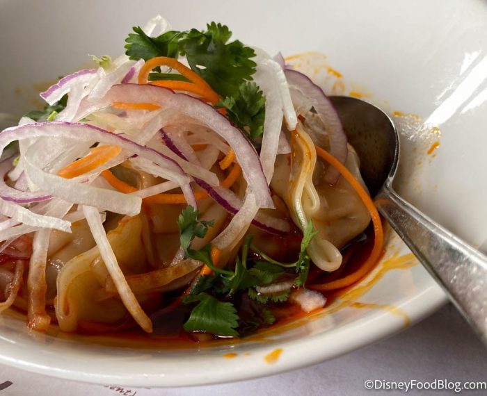 Guys — these dumplings were delicious! The sauce especially was really tasty, with a spicy and tangy flavor. It MADE this dish. And we were proud of Disney for actually having some spice in the sauce since we feel like they usually play it safe! It’s not overwhelmingly hot, but there was definitely a kick! If you’re averse to spice, obviously steer clear of this one. If you’re a fan of the spicier side of things, like us, you’ll be wishing this came in an entree-sized portion!