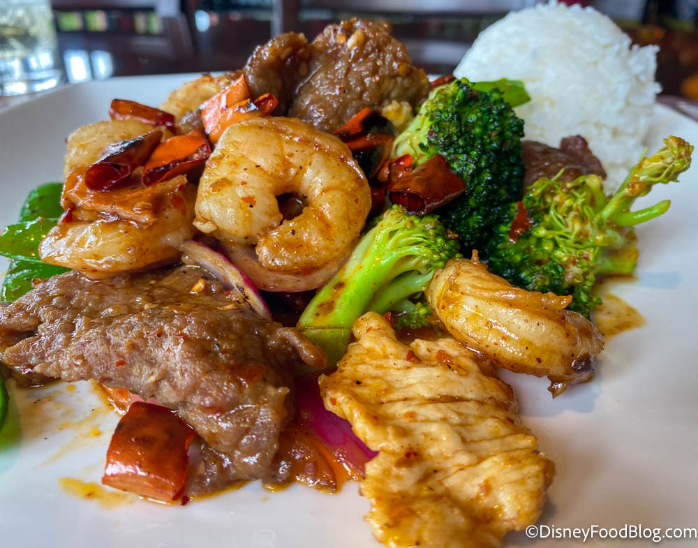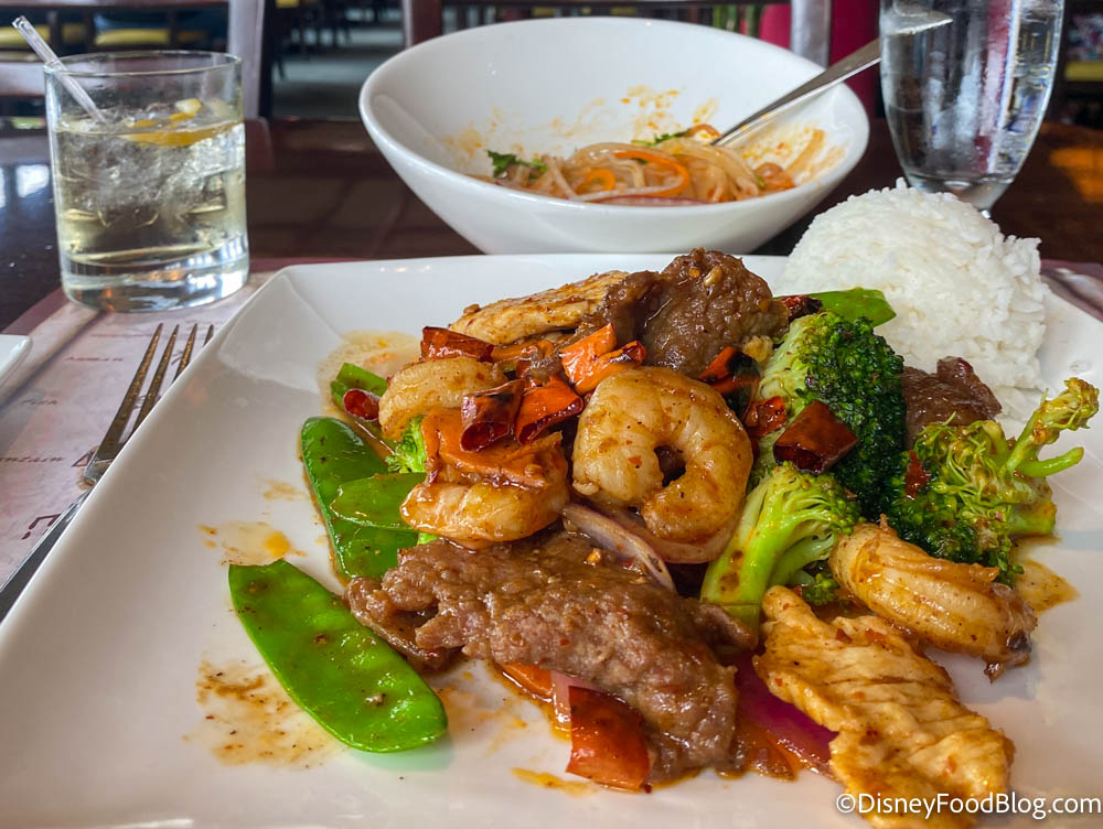 The Spicy Mala is a pretty classic stir fry — if you like stir-fries and are looking for a good one in Disney, you won’t be disappointed! This is actually quite a healthy meal, if you’re looking for a break from all the fried foods and cupcakes of Disney World! If you’re vegetarian or just don’t want so much meat in your meal, maybe go with the Vegetable and Tofu Stir Fry, on the menu for $18.
