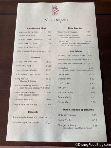 The dark wood and delicate light fixtures make Nine Dragons feel upscale, but it does still tend to put off standard Chinese food restaurant vibes on the interior, though. It’s pretty subdued compared to more aggressively “Disney” restaurants in the area. If many folks weren’t told this was a spot in EPCOT, they’d probably assume it was a restaurant back home.