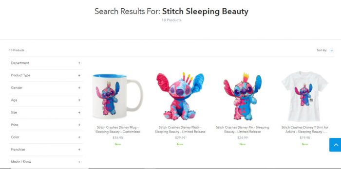 We eventually kept trying over and over and made it to the main shopDisney page, where we had to search for the new Stitch Crashes Sleeping Beauty collection.