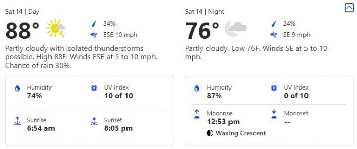 Get ready for an 88 degree high and a 75 degree low. But keep in mind that that high humidity can make the temperature feel around ten degrees higher. So get ready to sweat!