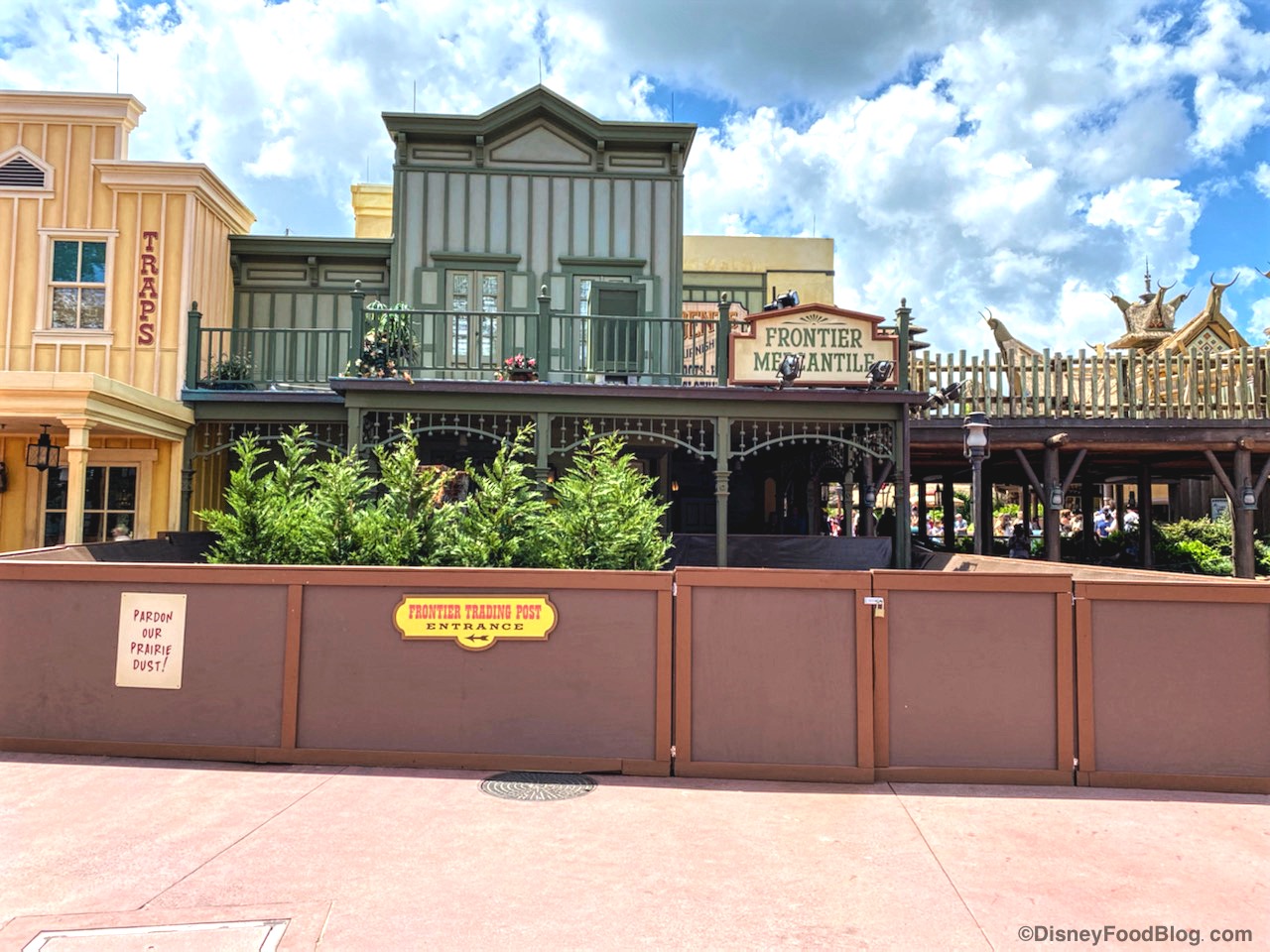 Along with the scrim, there is also a fenced area with some bushes behind it, right in front of Frontier Mercantile! There was also a sign directing guests towards the entrance of the Frontier Trading Post gift shop.