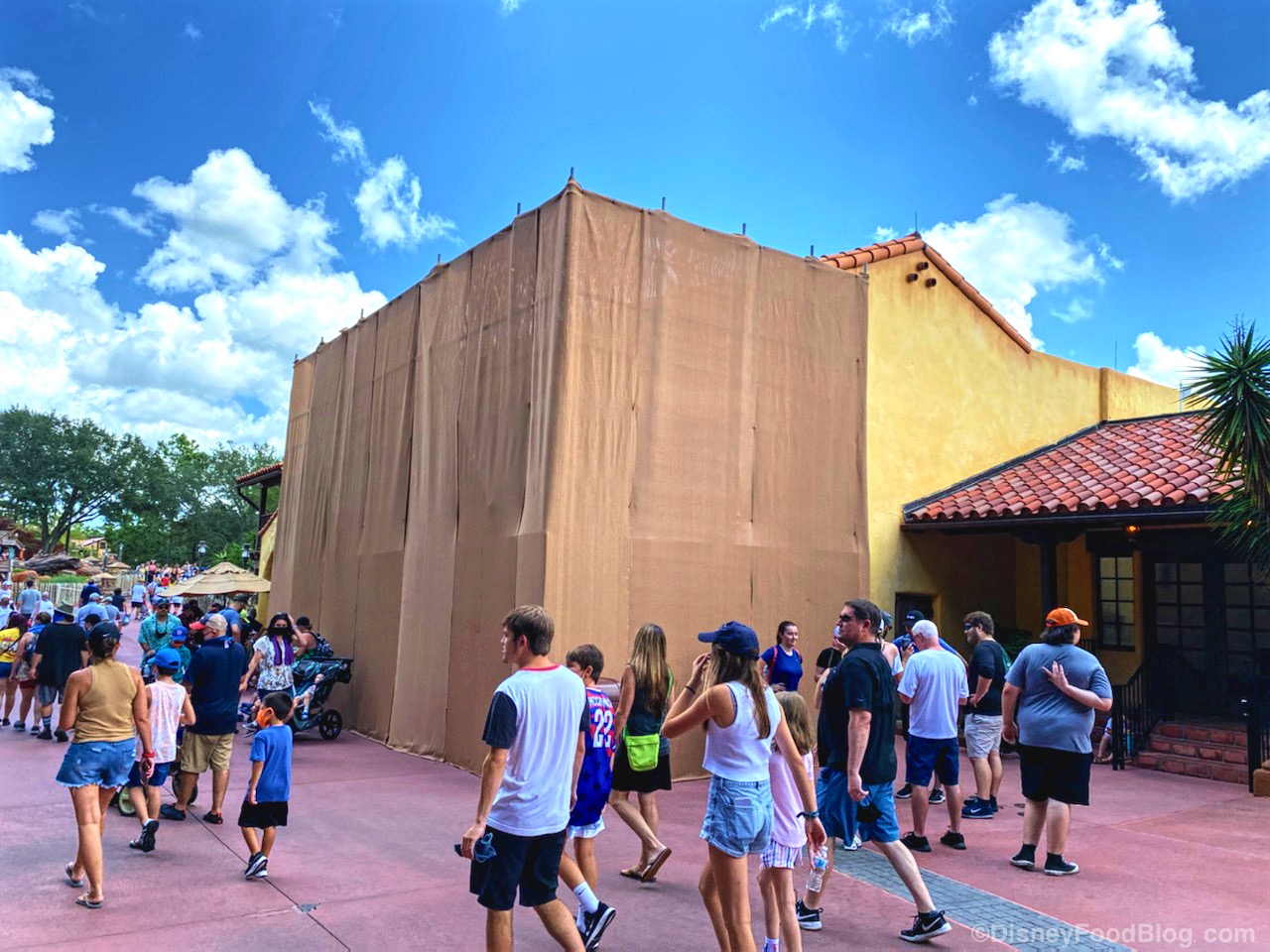 If you’ve been to Disney World lately, then you know exactly what area we’re about to discuss: Frontierland! We noticed a LOT of construction going on in this area today with massive scrim coverings (that big brown cloth they use to cover up construction) on some of the area’s buildings. We first noticed it over by Pecos Bill Tall Tale Inn and Cafe!