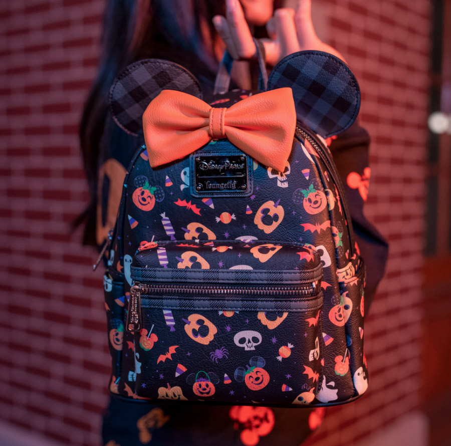 Disney also showcased a new Halloween Loungefly bag that has an orange bow and black and grey plaid ears. If you take a close look you can also spot a new Halloween Spirit Jersey in the background which is covered in pumpkins!