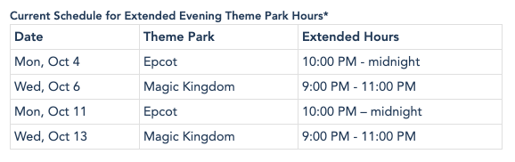 Disney World announced earlier this summer that they would be offering extended evening hours starting in October. Like Extra Magic Hours, the extended hours are only on select nights in select theme parks. Here’s a look at the first few dates: