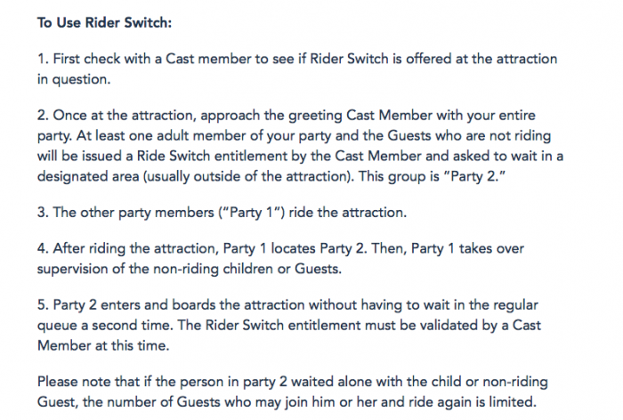 Now, Disney has changed some of their language regarding Party 2 and the Rider Switch scenario. The updated language on Disney’ World’s website now states: “Please note that if the person in party 2 waited alone with the child or non-riding Guest, the number of Guests who may join him or her and ride again is limited.”
