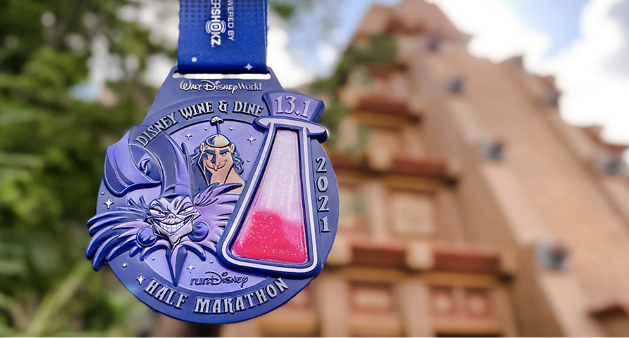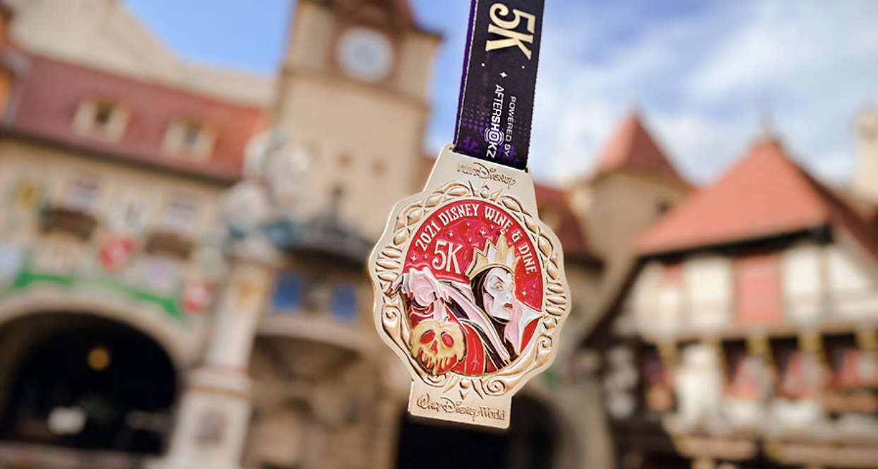 The Wine & Dine Half Marathon will take place November 4-7, 2021 at Disney World. Each race has a different theme, and runners can choose between running a 5K, 10K, Half Marathon, or the Two Course Challenge, which is a combination of the 10K and the Half Marathon. Depending on which race you choose to run, you get a different medal! For the Disney Wine & Dine 5k race, runners will earn this Evil Queen medal featuring her iconic poison apple.