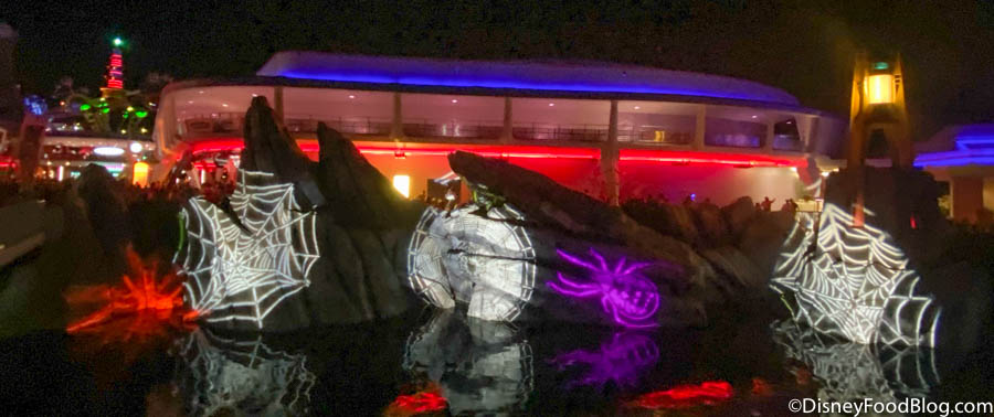 During Boo Bash, however, guests will also be treated to some special lighting and music to set the spooky tone. Over in Tomorrowland, we found spider webs and spiders being projected onto some of the rock walls.