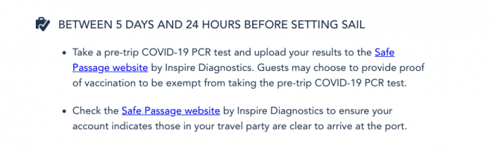 Between 5 days and 24 hours setting sail, cruisers must meet other requirements, like taking a pre-trip COVID-19 PCR test and more.